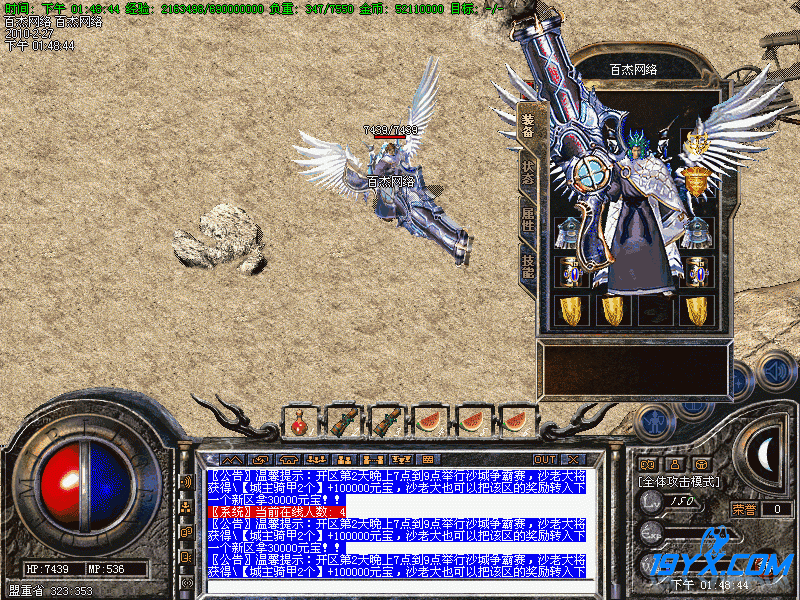 温馨提示:开区第2天晚上7点到9点举行沙城争霸赛,沙老大将获得【城主骑甲2个】+100000元宝,沙老大也可以把该区的奖励转入下一个新区拿30000元宝!!