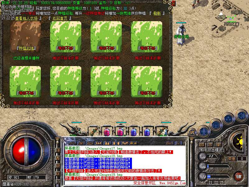 1;传奇农场;增加了最潮流的传奇农场,每偷取,摘都能加种植经验,只能偷在线玩家成熟的果实,种植级别越高,种品种的越多,能偷的种类也就越多,收获的果实,可以换元宝,换装备。