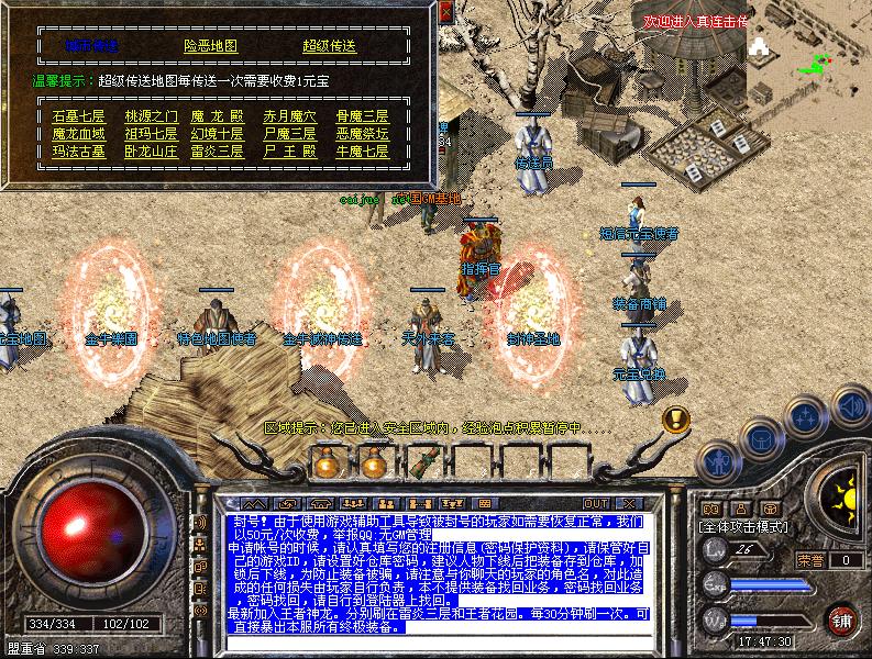 最新加入幸运楼阁(幸运项链的暴率很高)祝福大殿(祝福油的暴率非常高)/练级广场(非RMB玩家的练级天堂),请玩家从土城新增地图NPC进入.