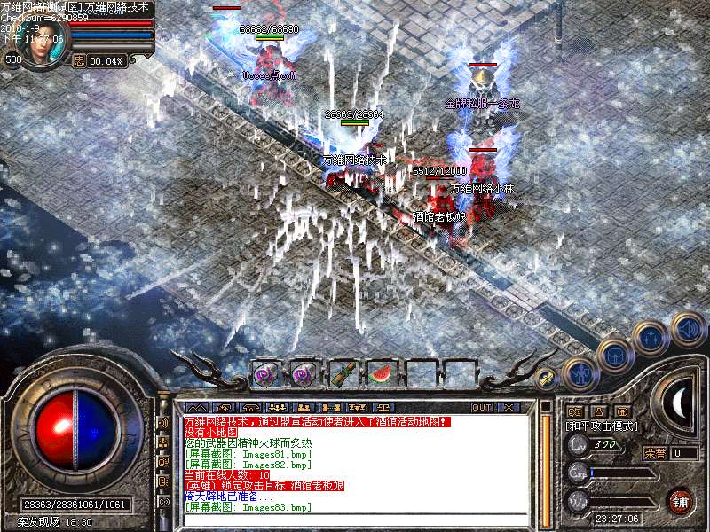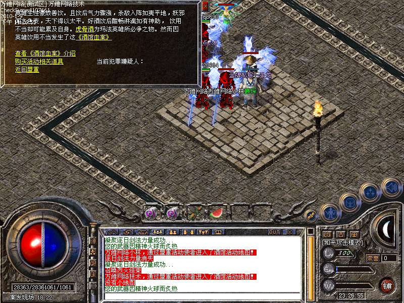 活动④: 倚天剑阵,不断的向剑阵中投入魔法神石,达到100颗有机会奖励倚天剑一把,38个BOSS,每个BOSS必爆魔法神石一颗,每小时刷新一次.