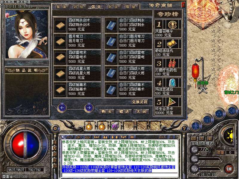 四级技能(英雄一样):四级基本剑术,四级刺杀剑法,四级圆月弯刀,四级雷电术,四级流星火雨,四级施毒术,四级噬血术