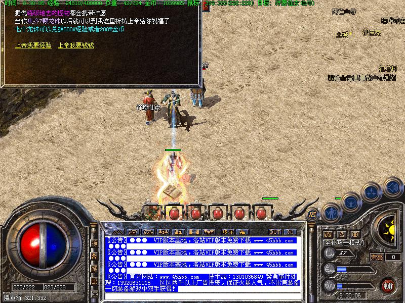更新提示:增加战士新技能.《逐日剑法》威力非常强大,获得途径,土城左上角NPC做任务获得《火龙气焰》尸王身上获得,或者轮回使者身上获得!