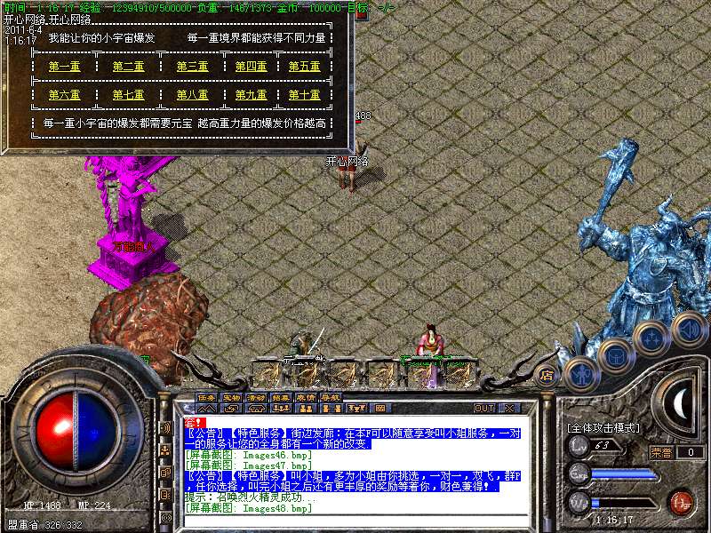 【转生系统】盟重土城左边的转生雕像那里完成转生.转生后可获得属性奖励.还有酷炫的转生封号.