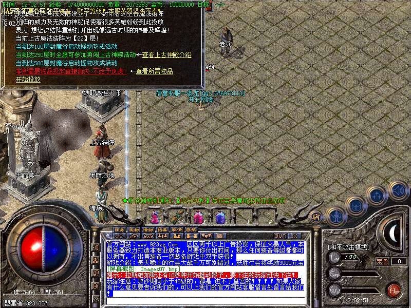 〖天下第一〗:每职业等级第一名随时在比齐皇宫申请,可获得1.2倍攻魔道!②.行会争霸:每天下午18点,土城左上角点功城公告牌进入,