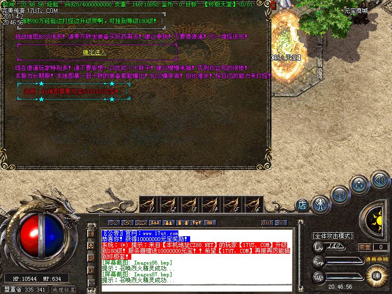 【元宝回馈】休息间每半个小时刷一只元宝怪!会爆出大量财富!必争之地!并且元宝怪死的地点人物站上可每秒产生1000W经验,太疯狂了!