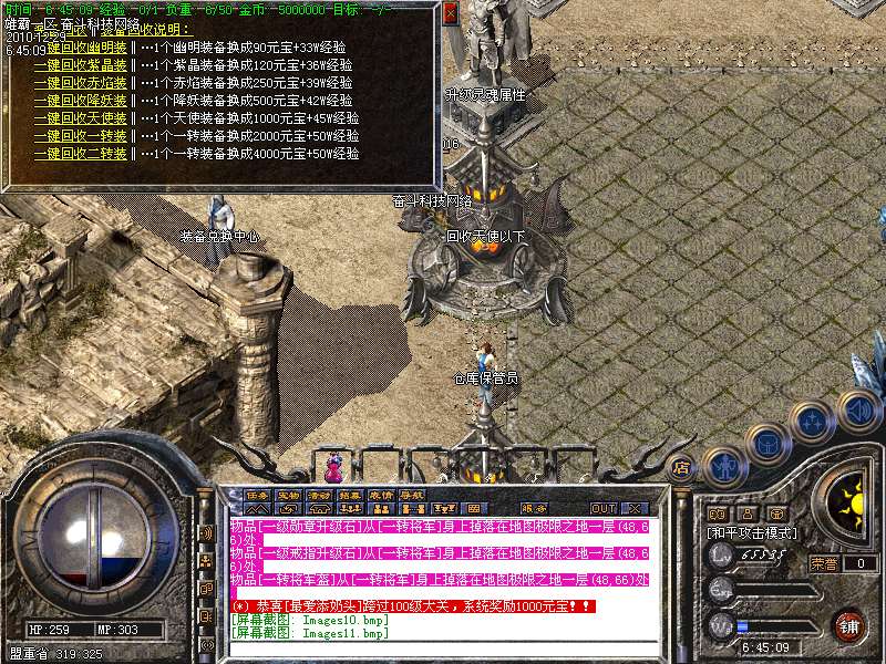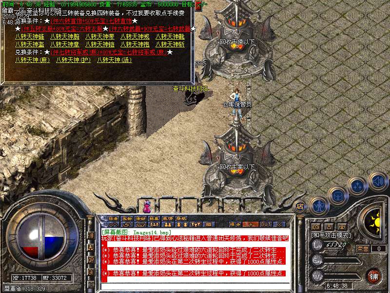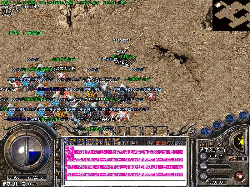 1、本F独家9转装备。。。极限7层。。装备绝对全部可以爆出。。不像有些私服打着装备全暴的名号。其实根本就暴不出来。。本F爆不出来死妈。。新手刚出来去土从右到左可以打到开荒装备。。然后够元宝的可以买两倍攻击石。然后转生。就可以去极限之地打转生装备了。。极限之地本F独家7层。1层爆1转。2层爆2转。。绝对的公平。。。3层爆3转以此类推