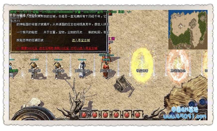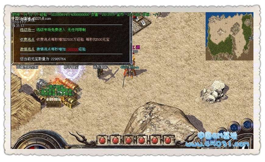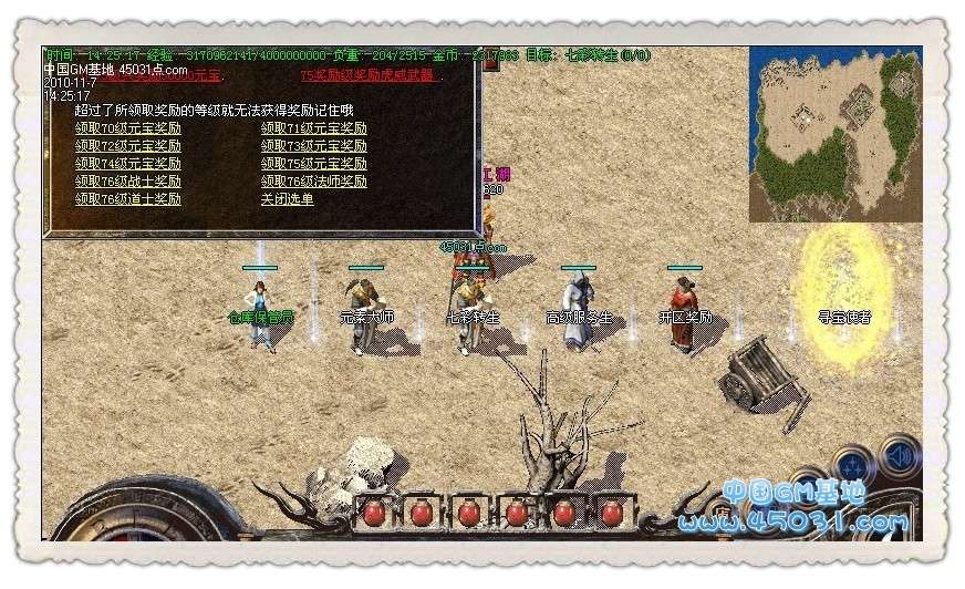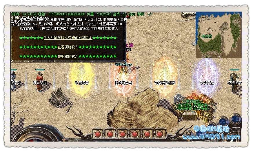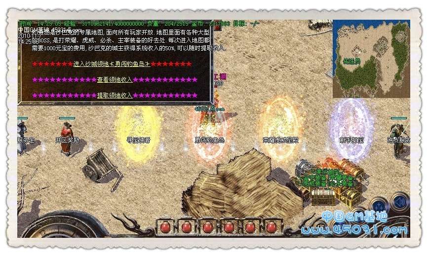 【攻城奖励】新区第一任沙城主获得100万元宝!!攻下城堡之后在土城安全区右上角找攻沙奖励NPC领取。只可以领取一次,切记是在10点以后,15分钟内领取奖励。