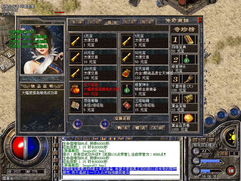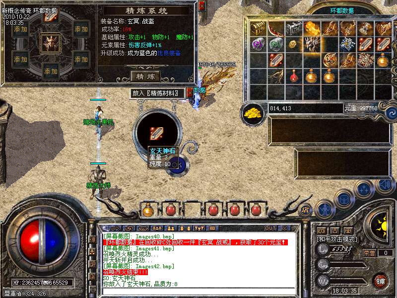 【装备精炼系统】我们一直在追求更强,那么,在都拥有差不多的同等装备下,装备精炼能将你的装备轻易提升到另一个高度,拥有一身紫色传奇级装备,那么走在传奇的每一个角落,都会受到全服玩家追逐欣赏,羡慕眼红的目光!